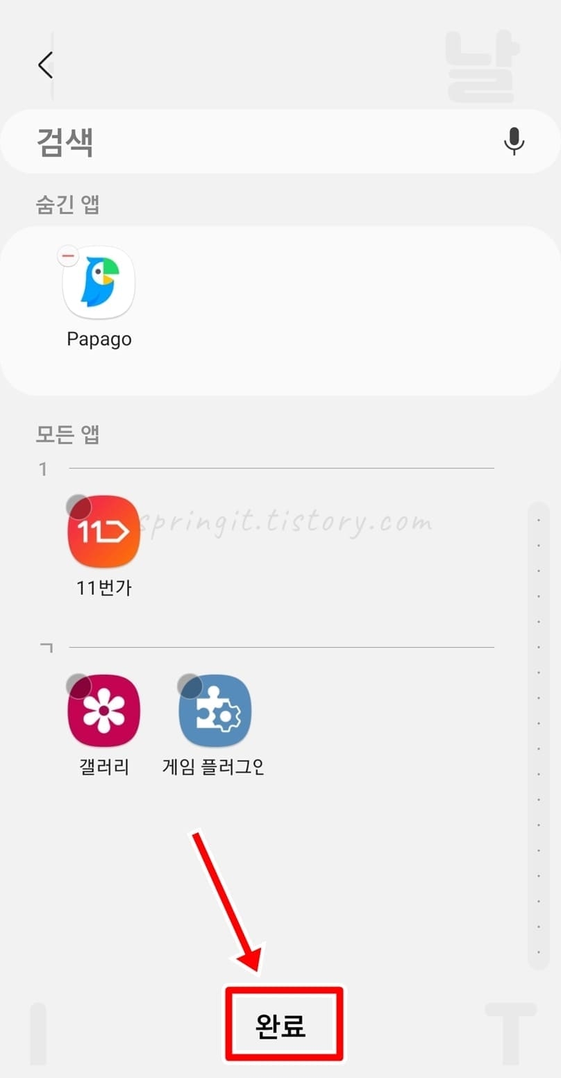 6. 홈 및 앱스화면에서 앱이 숨김 처리되었습니다.