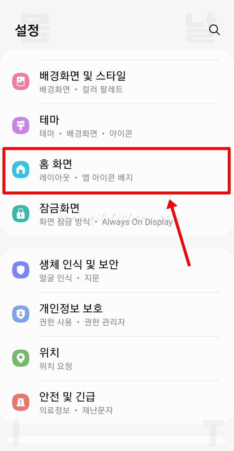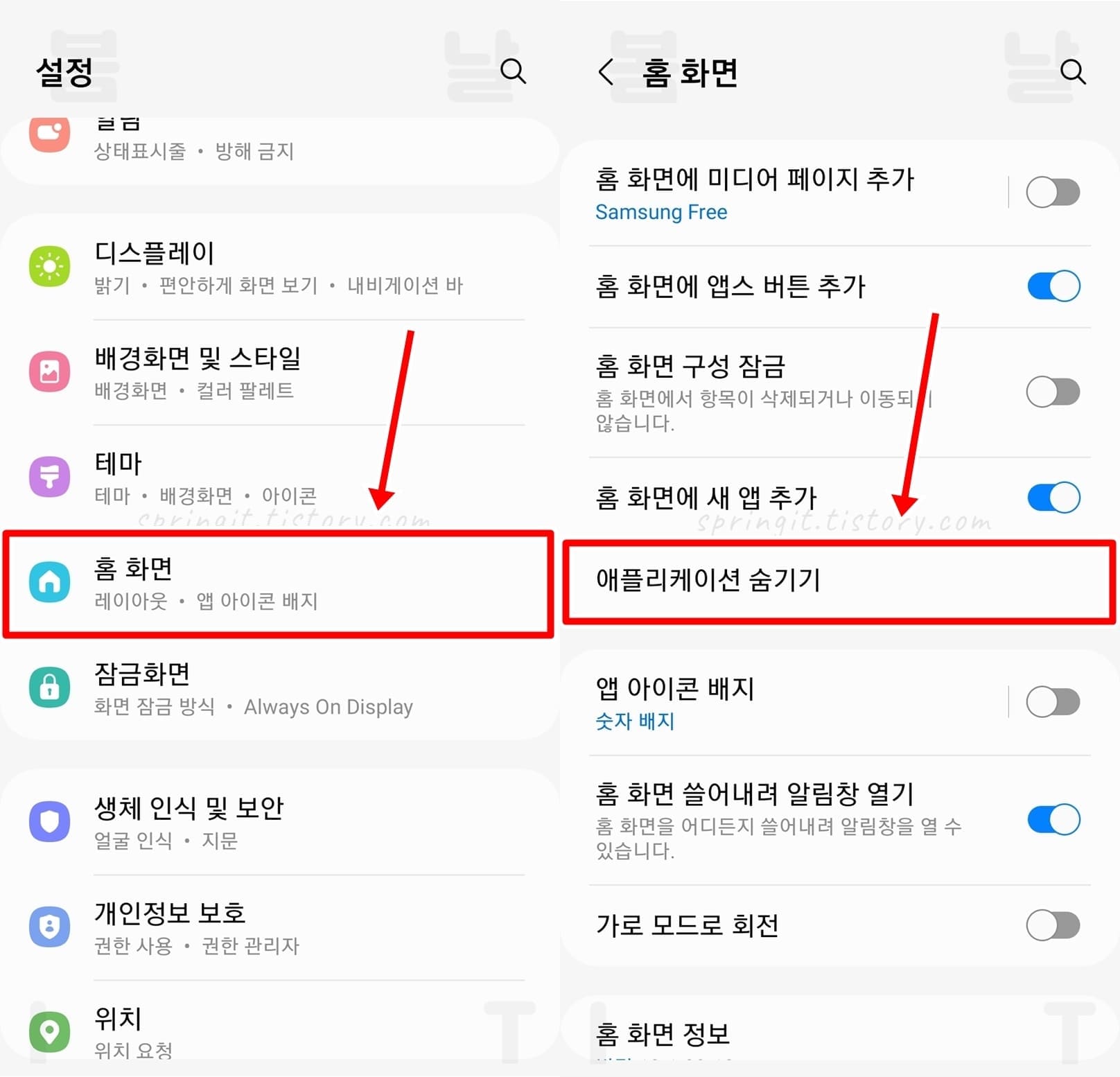 1. 설정 앱 실행 후 홈화면 > 애플리케이션 숨기기로 들어갑니다.