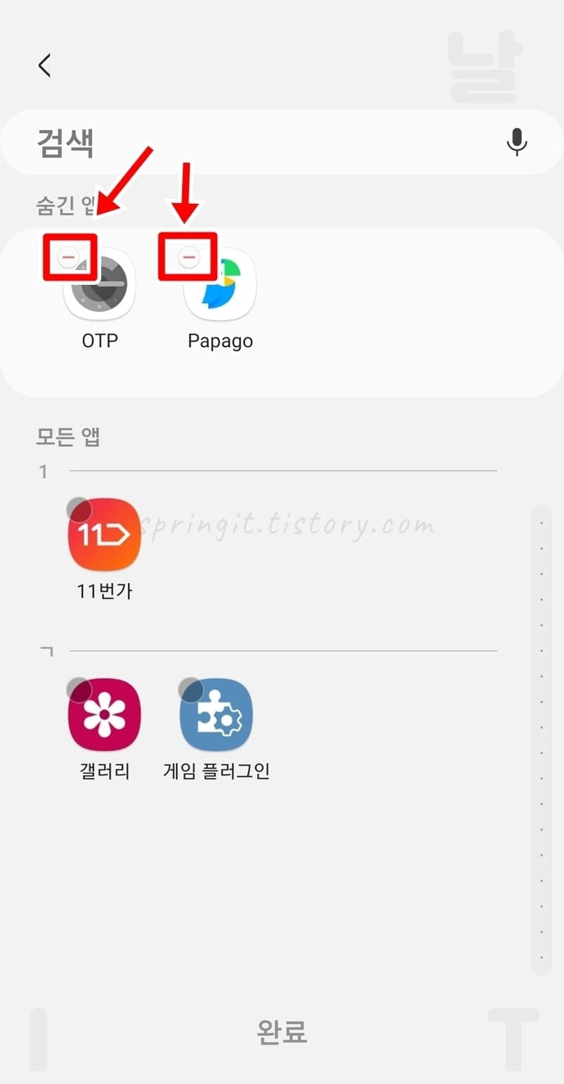 2. 상단 숨긴 앱 목록에서 [-] 버튼을 눌러줍니다.