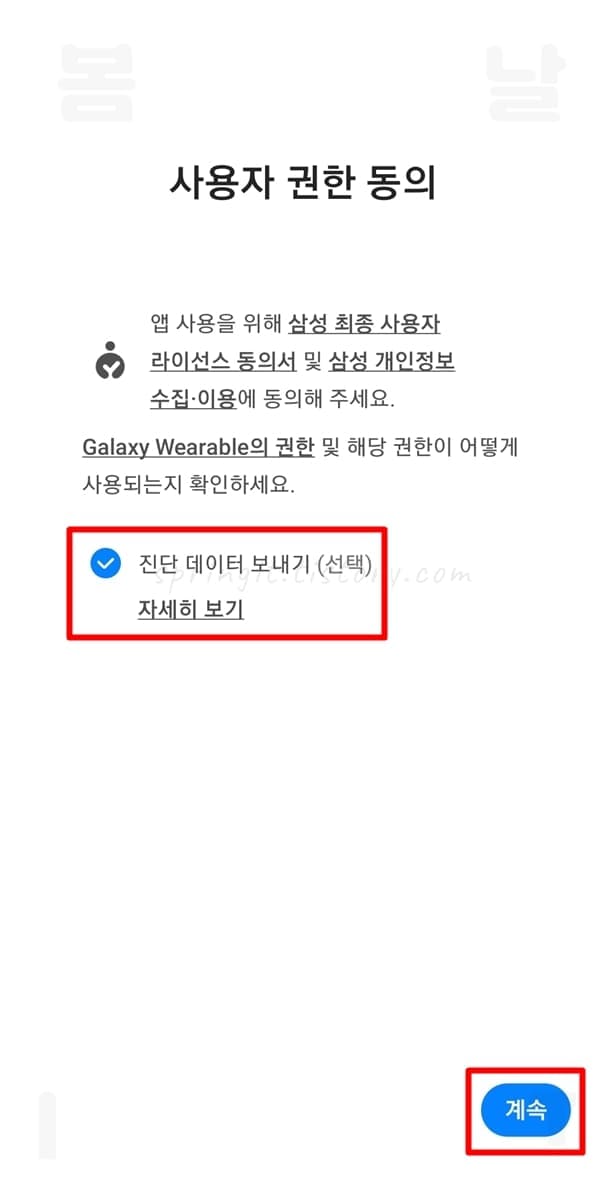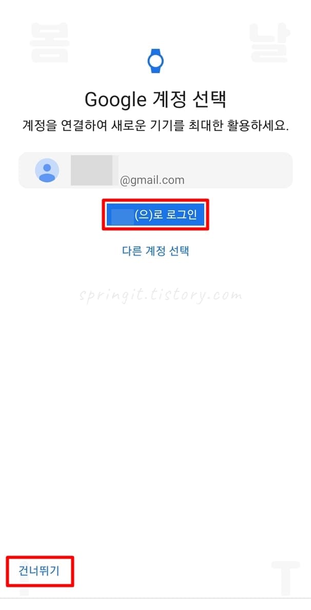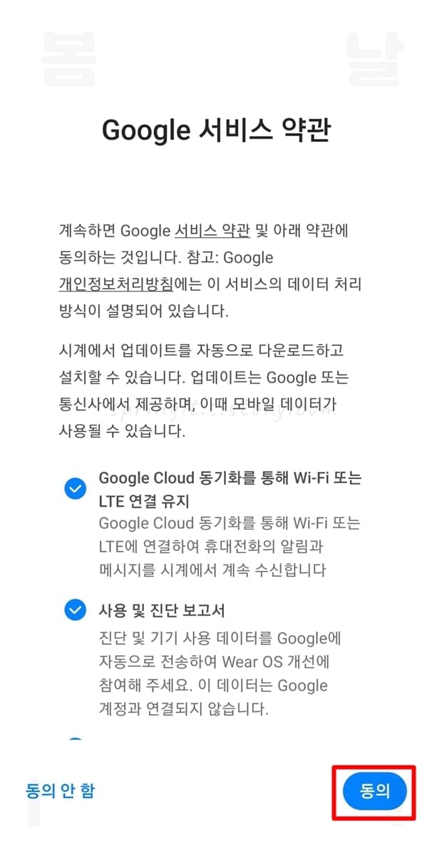 갤럭시 워치의 모든 기능을 활용하기 위해서 구글 계정으로 플레이 스토어 등을 연결하게 됩니다. 따라서 필수적으로 동의해주시고 넘어가주세요.