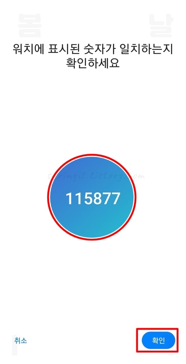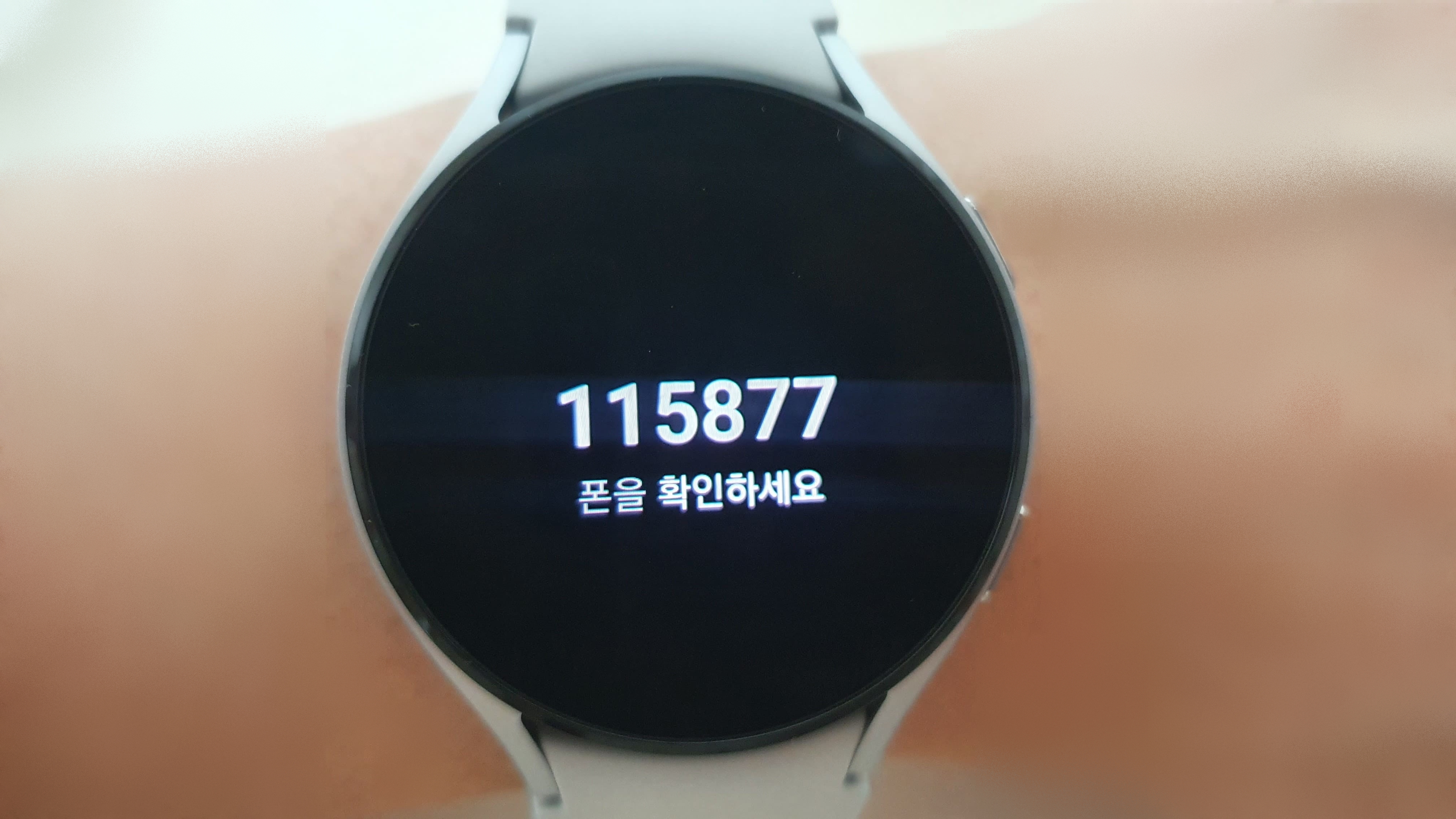 이 과정은 갤럭시 워치 원격 연결시 잘못된 디바이스와 연결되는 일을 막기 위해서 확인하는 절차입니다. 저의 경우 115877로 표시되었네요.