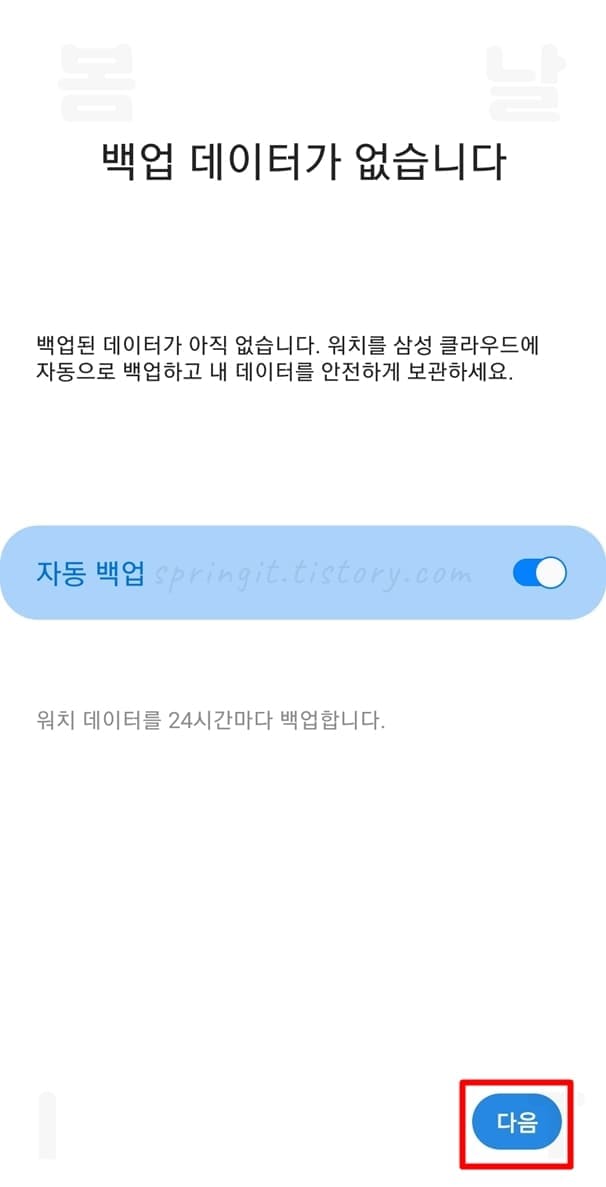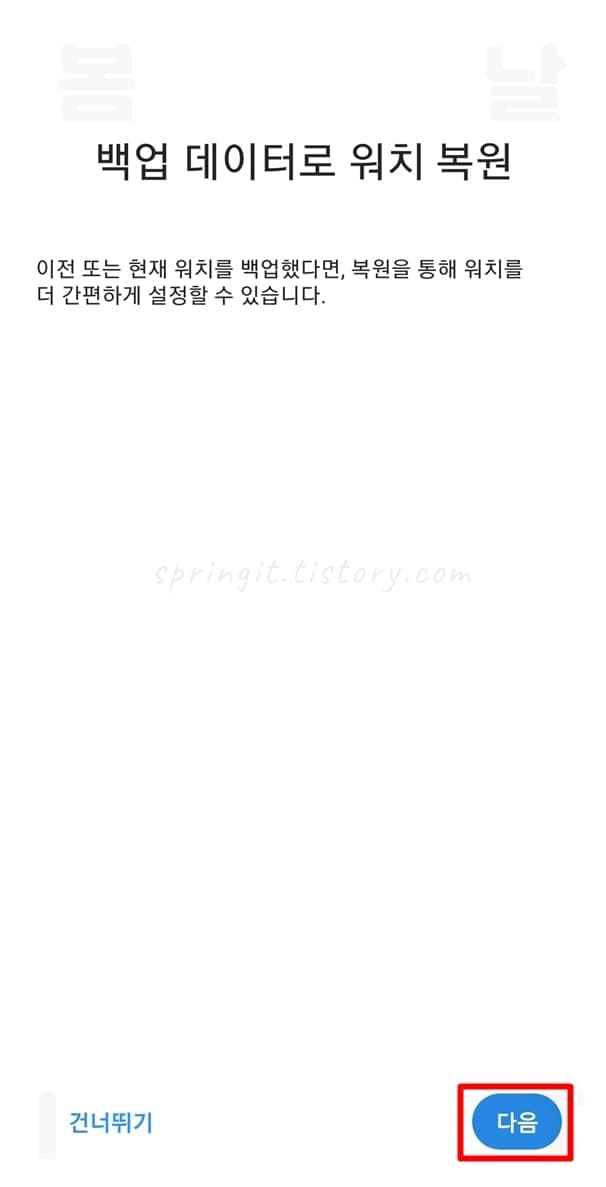 16. 백업 데이터로 워치 복원에서 다음을 누릅니다.