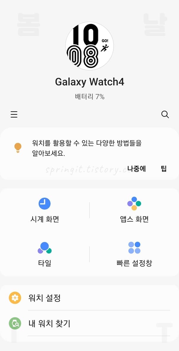 갤럭시 웨어러블 앱에서 연결된 갤럭시 워치 정보를 확인할 수 있습니다. 기기명을 바꿀수도 있고 배터리 상태를 앱에서 확인하는 것이 가능합니다. 또한 시계화면을 바꾸거나 워치 설정을 변경하는 것도 가능합니다.