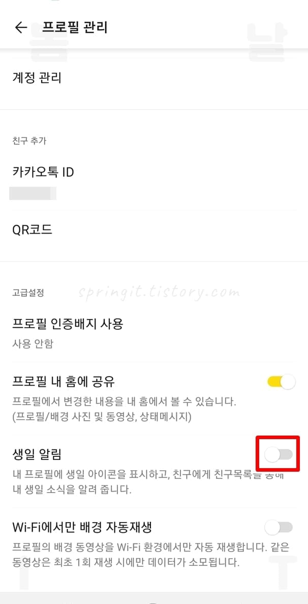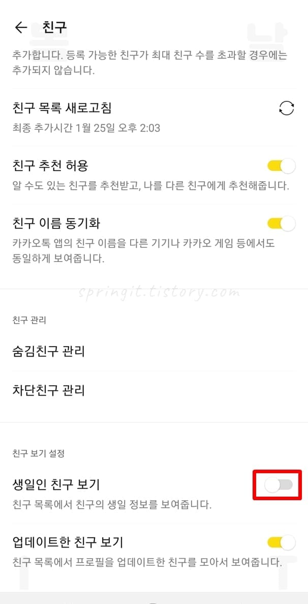 원터치시 동그라미가 왼쪽으로 옮겨지고 회색 배경이 되면서 기능이 꺼지게 됩니다. 이제 친구의 생일 정보 알림이 뜨지 않습니다. 추가로 여기서 업데이트한 친구 보기 기능도 끌 수 있으니 편리하게 이용해보세요.