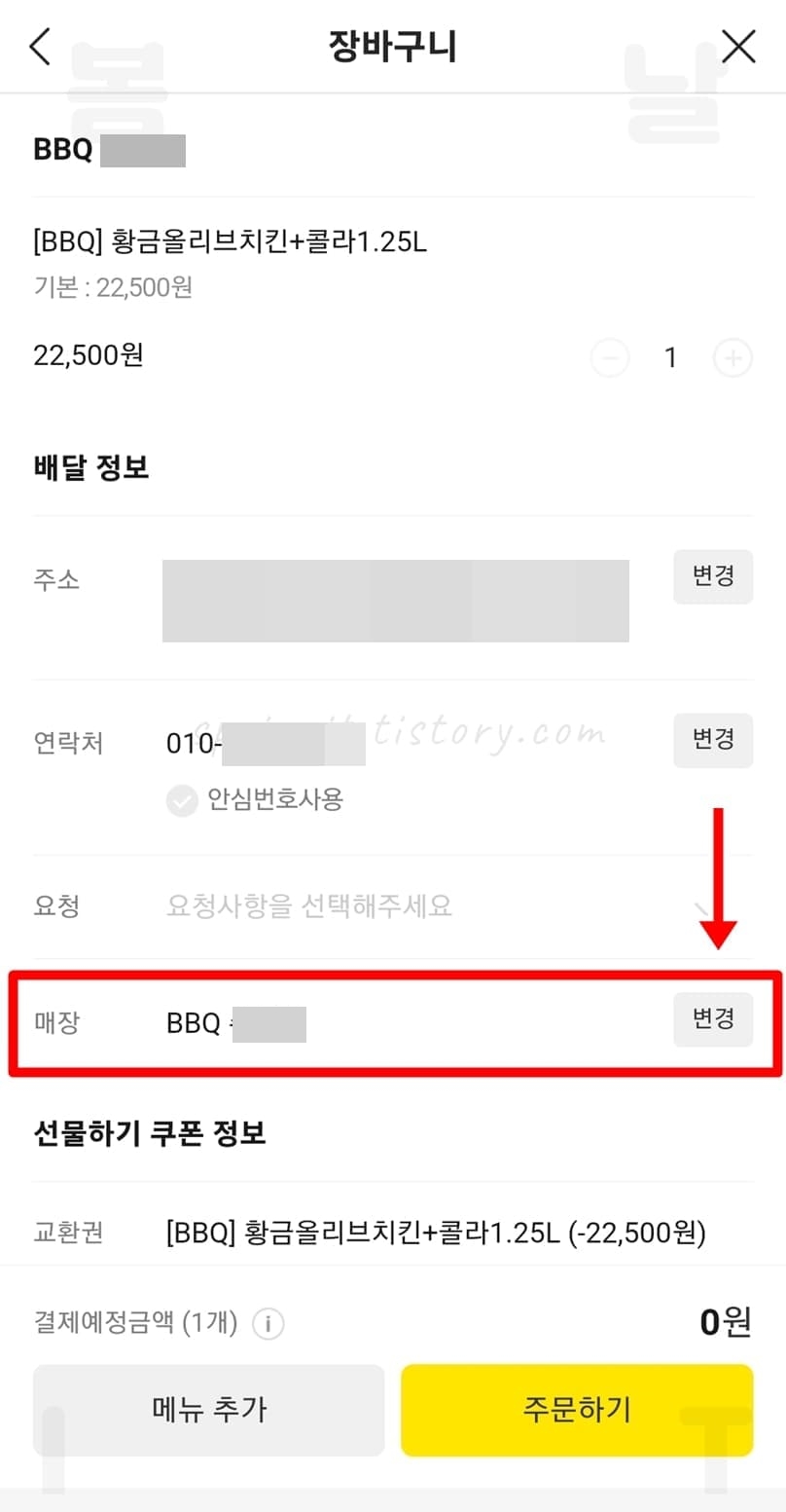 카카오톡 BBQ 기프티콘 메뉴 변경하는 방법