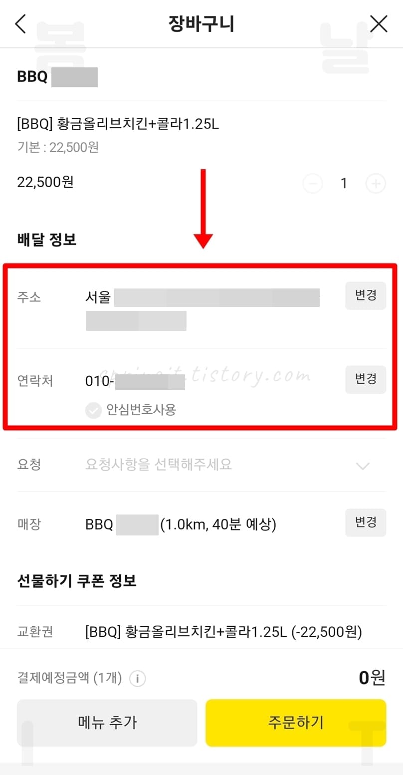 5. 배달정보에서 주소와 연락처의 우측 변경 버튼을 누릅니다.