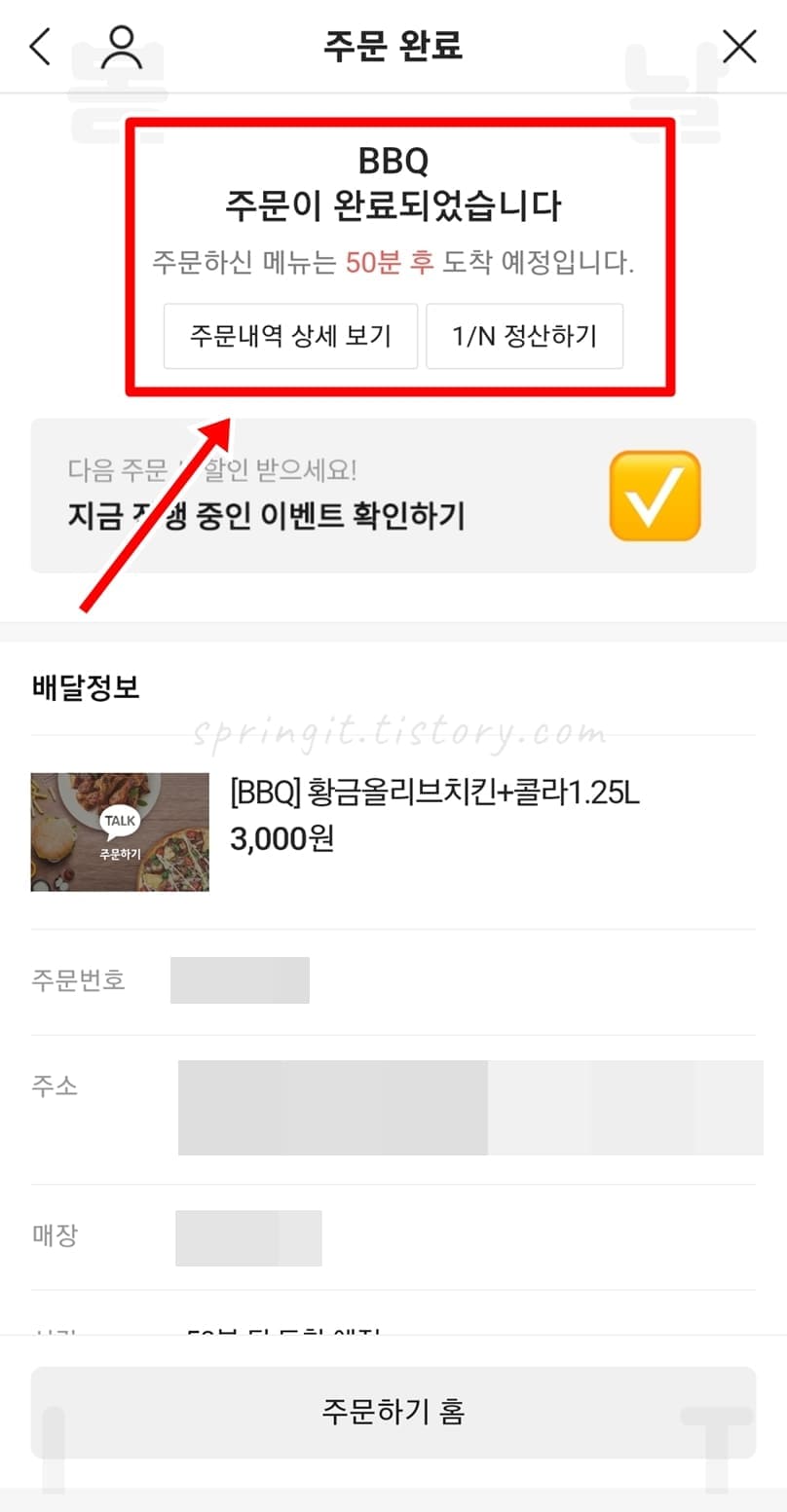 BBQ 카톡 메시지로도 내가 주문한 메뉴, 주문일시, 주문매장, 도착 예정 시간 정보가 발송되니 꼭 확인해보시길 바랍니다.