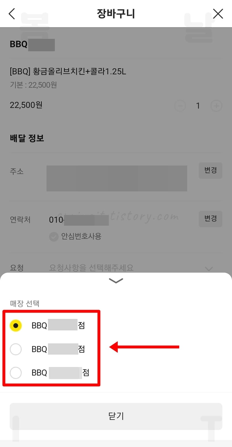 8. 주문하고 싶은 가까운 BBQ 매장을 선택 체크합니다.