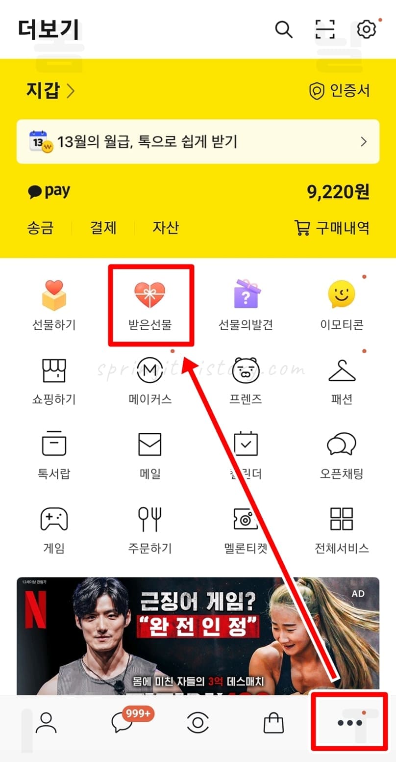 2. 더보기 화면에서 받은 선물을 클릭합니다.