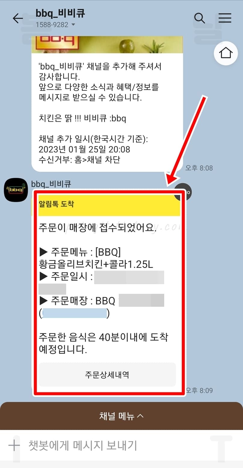 BBQ 카톡 메시지로도 내가 주문한 메뉴, 주문일시, 주문매장, 도착 예정 시간 정보가 발송되니 꼭 확인해보시길 바랍니다.