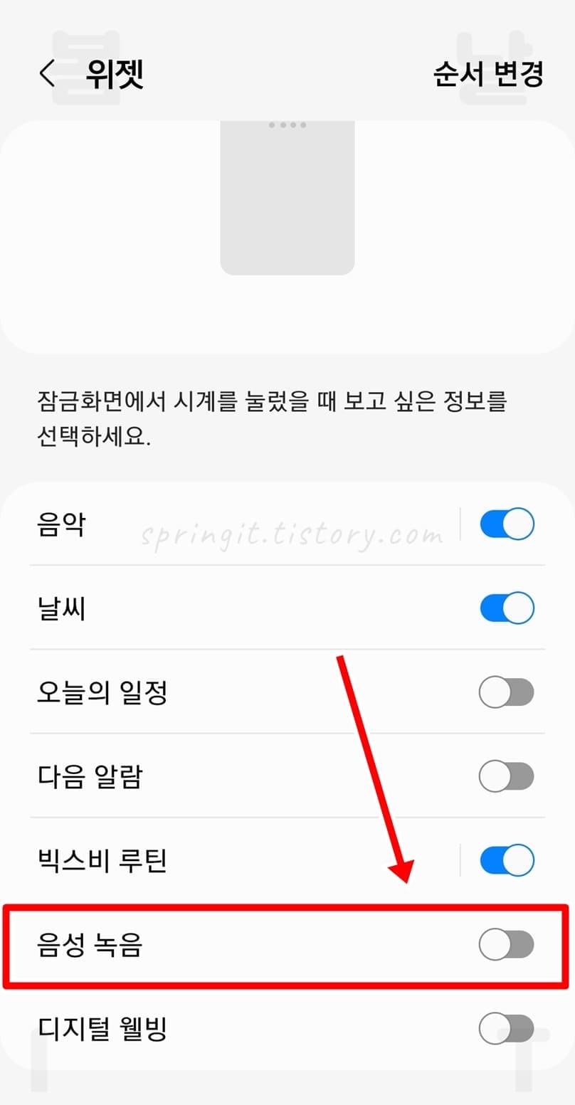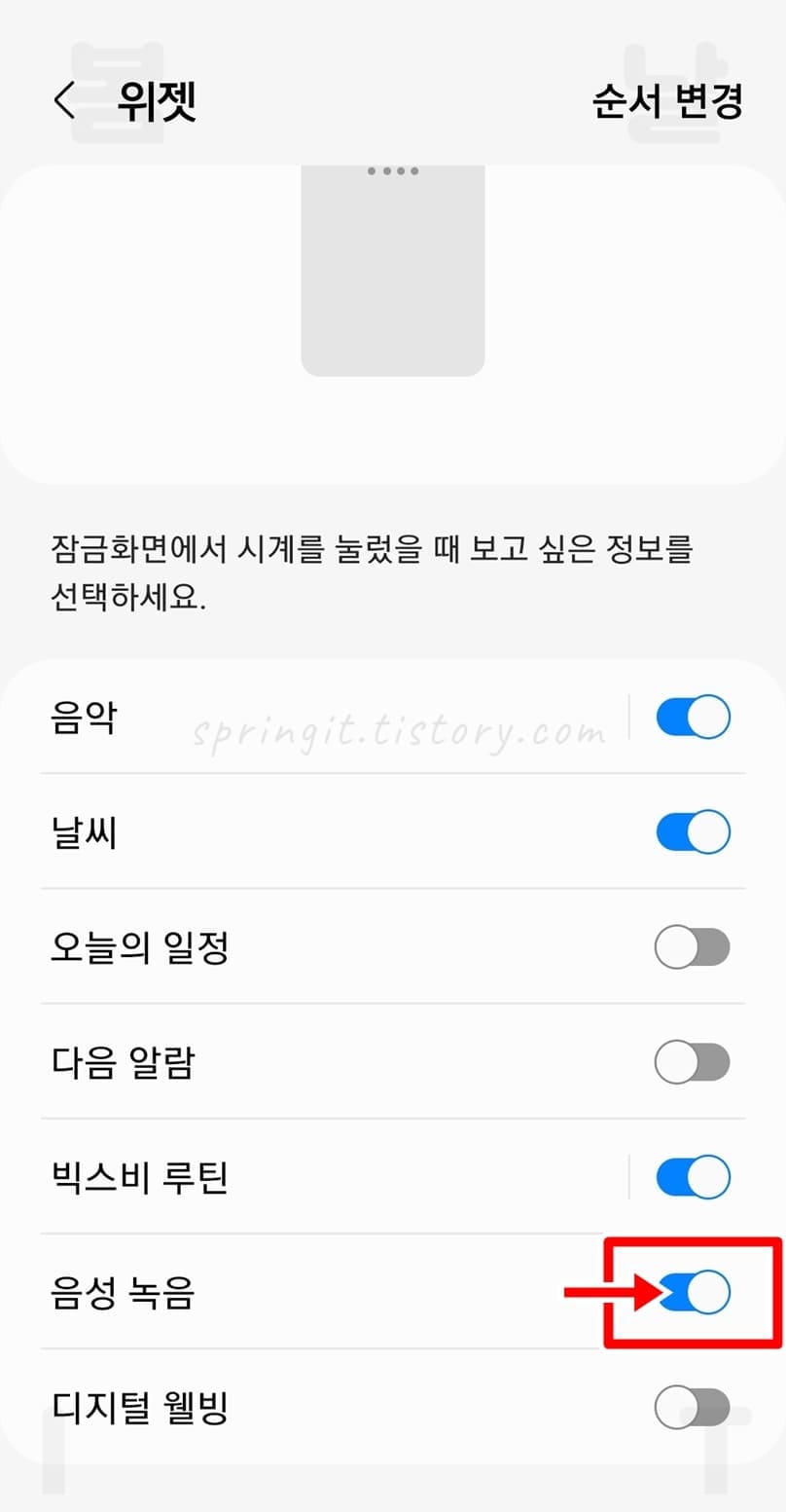 4. 음성 녹음 위젯 우측 토글을 눌러 활성화합니다.