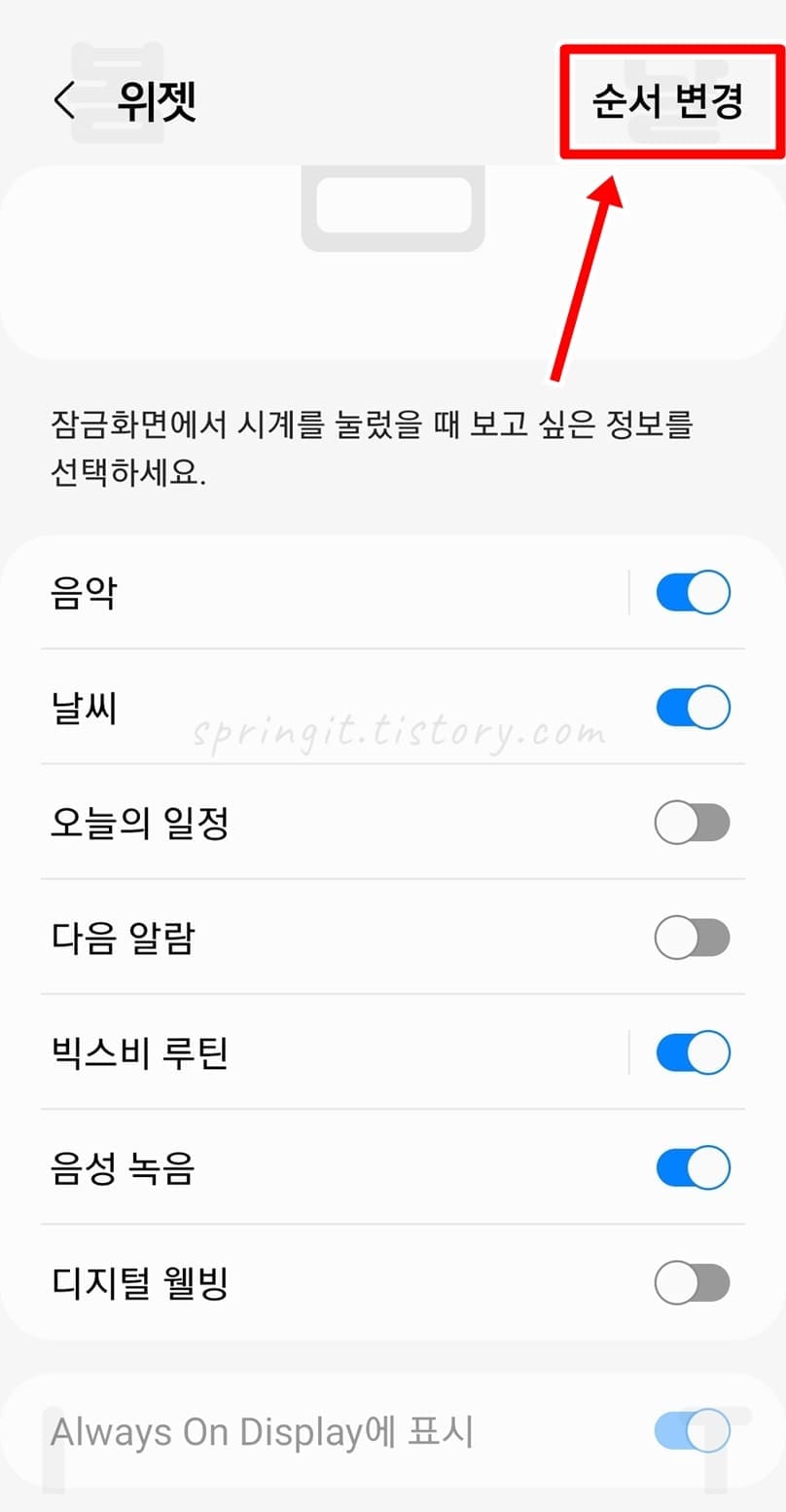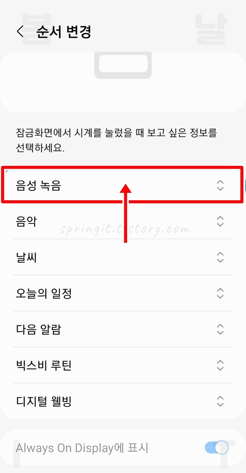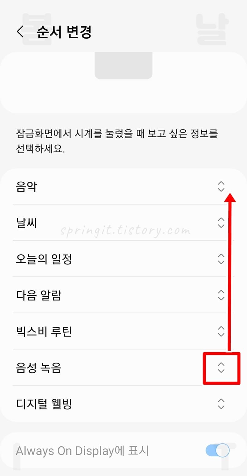 여기서 보여지는 목록순서가 잠금화면에 표시되는 순서와 동일한데요. 그렇기에 음성 녹음이 너무 아래에 있을 경우 잠금화면에서도 한참 아래로 내려서 찾아야 하기에 불편합니다. 그래서 잠금화면 맨 위에 음성 녹음이 보이게 만들어보도록 하겠습니다.