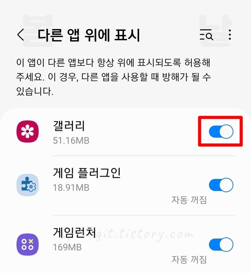 6. 우측 토글을 활성화하면 다른 앱 위에 표시 권한이 허용됩니다.
