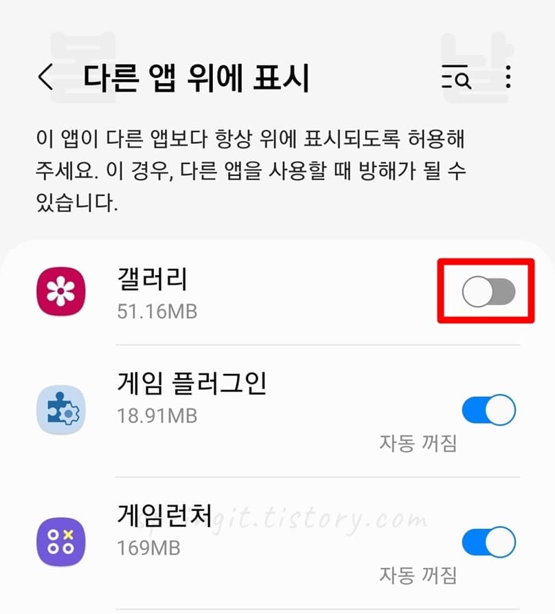7. 우측 토글을 비활성화하면 다른 앱 위에 표시 권한이 해제됩니다.