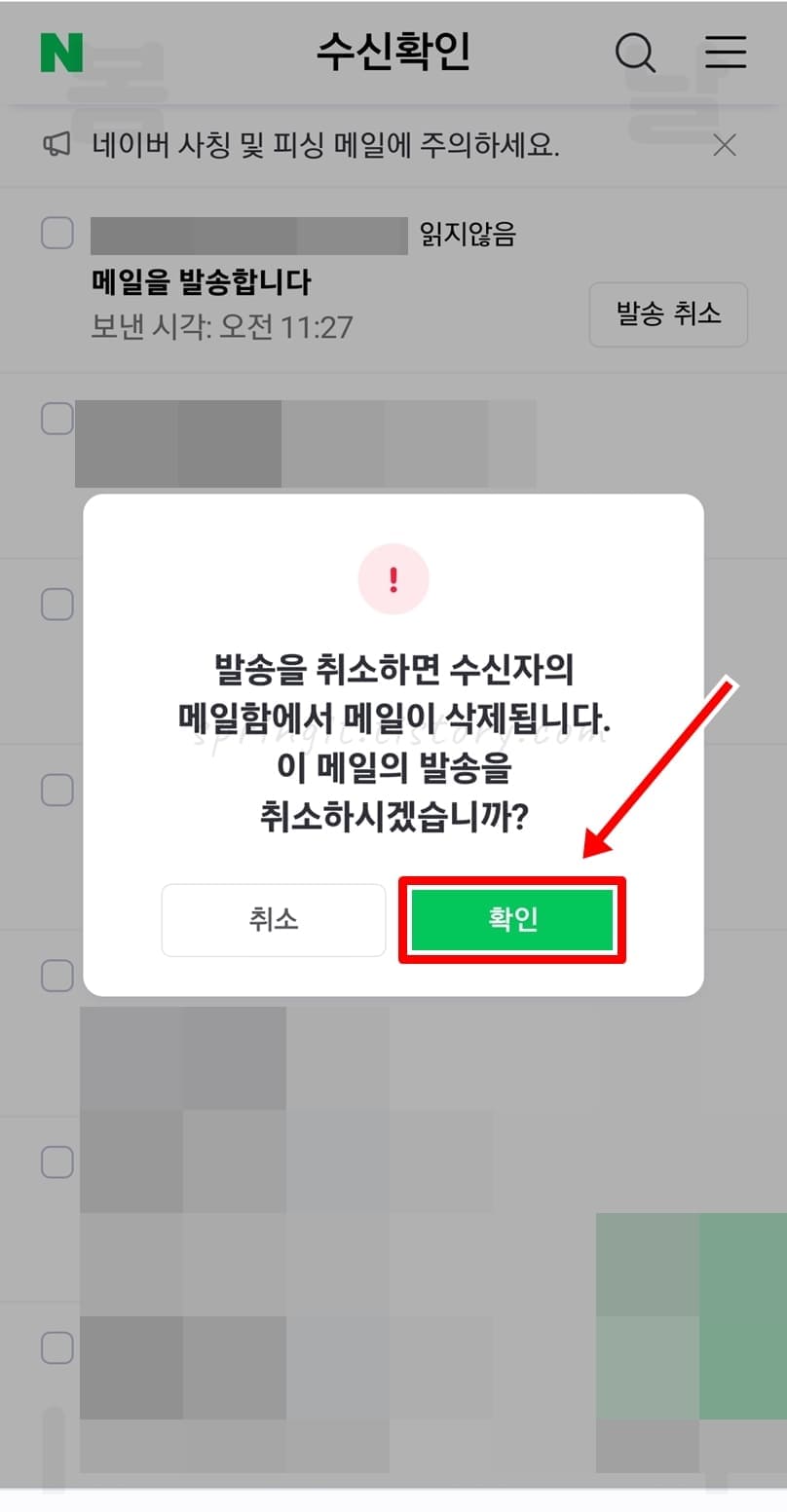5. 발송 취소 팝업에서 확인을 누릅니다.