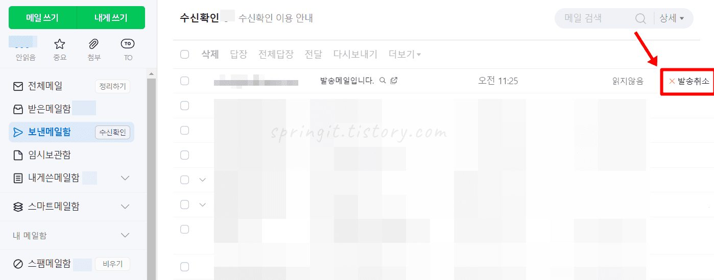 4. 내가 잘못 보낸 이메일을 찾은 후 우측 발송 취소 버튼을 누릅니다.