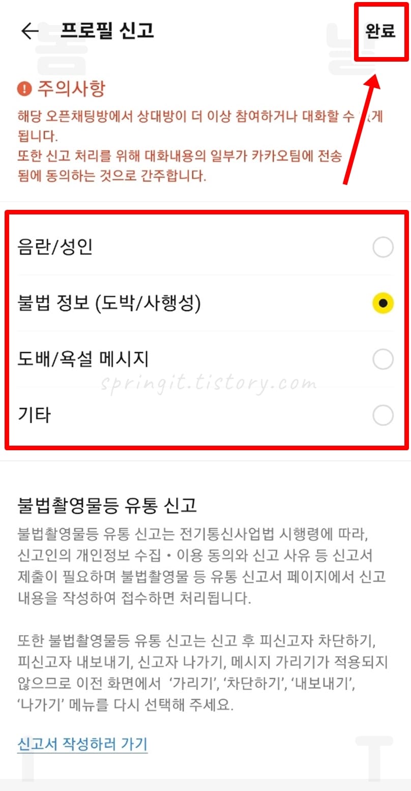 3. 신고할 유형에 체크하고 완료를 클릭합니다.