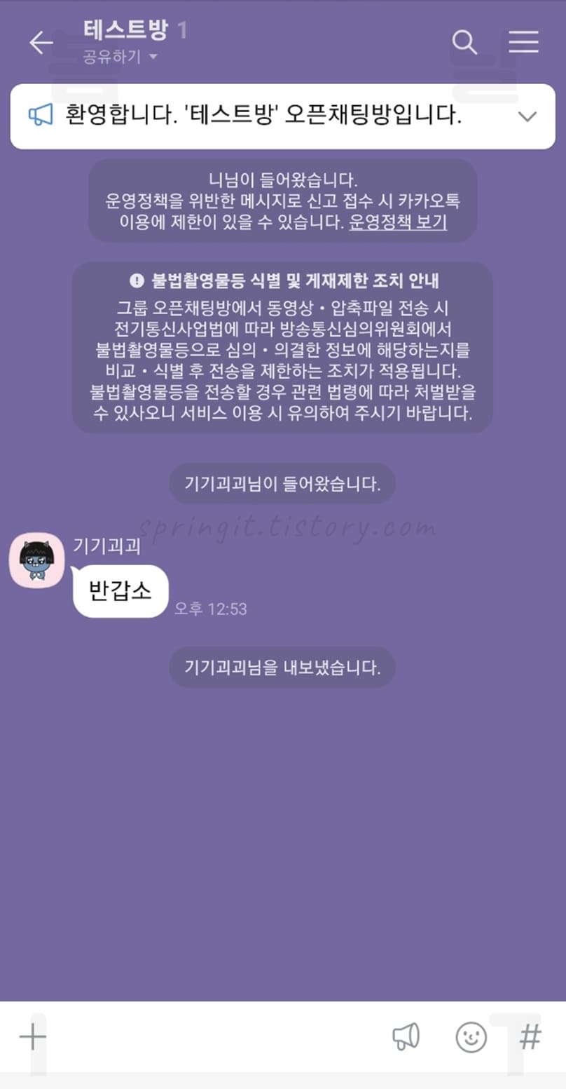 안녕하세요 봄날의아이티입니다. 오늘 글에서는 카카오톡 오픈채팅방 내보내기(강퇴) 방법을 소개드리도록 하겠습니다. 카카오톡 오픈채팅방은 기본적으로 익명으로 참여되기에 배려없는 반말에 욕설, 음담패설등을 하는 사용자들이 나름 있는 편입니다. 이런 불건전한 이용자가 오픈채팅방에 들어오게되면 방을 관리하는 방장, 부방장은 상대방을 강퇴 내보내기를 할 수 있는데요. 이렇게 내보내진 상대방은 다시 오픈채팅방을 참여할 수 없게 완전히 내보내지게 되며 나중에 운영진(방장, 부방장)이 내보내기 해제를 해주지 않는 한 오픈채팅방을 다시는 참여할 수 없습니다.