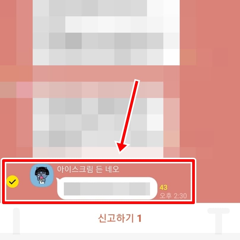 2. 신고할 상대방의 메세지를 체크하고 신고하기를 누릅니다.