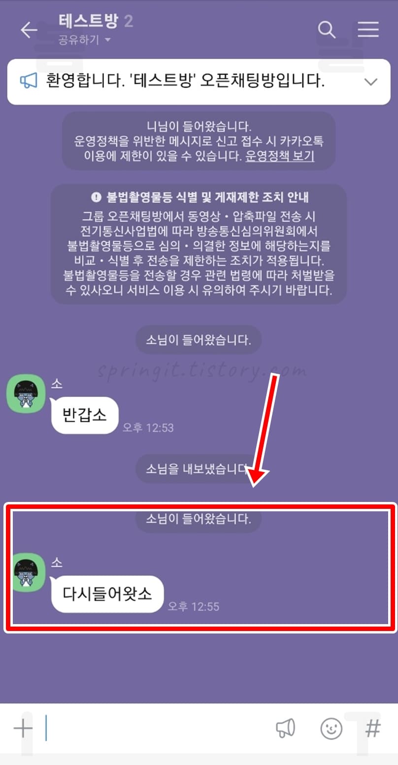 6. 내보내진 상대방이 다시 오픈채팅방 참여가 가능합니다.