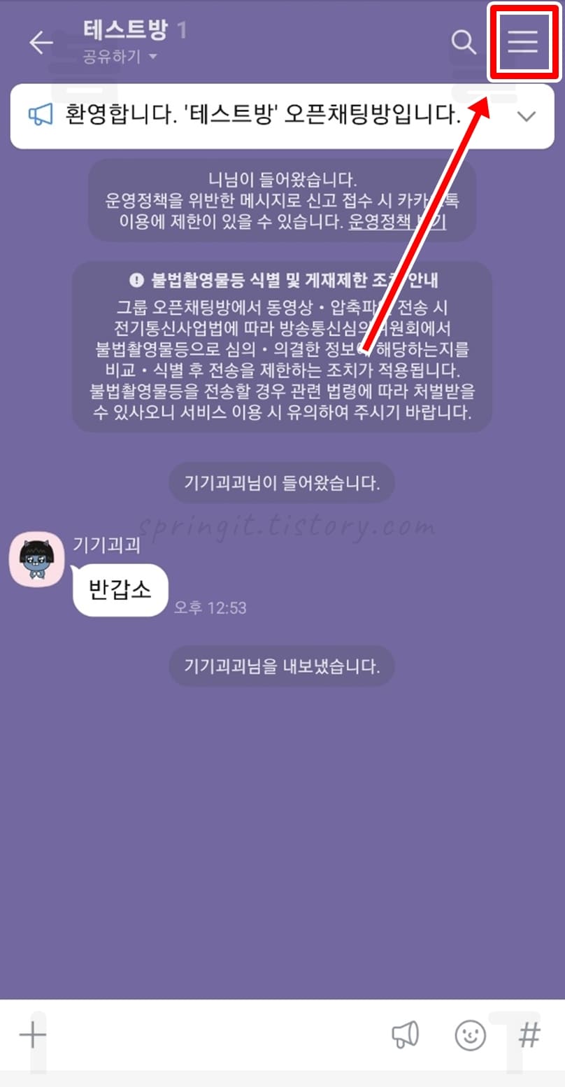1. 오픈채팅방에서 우측 상단 더보기 버튼을 클릭합니다.
