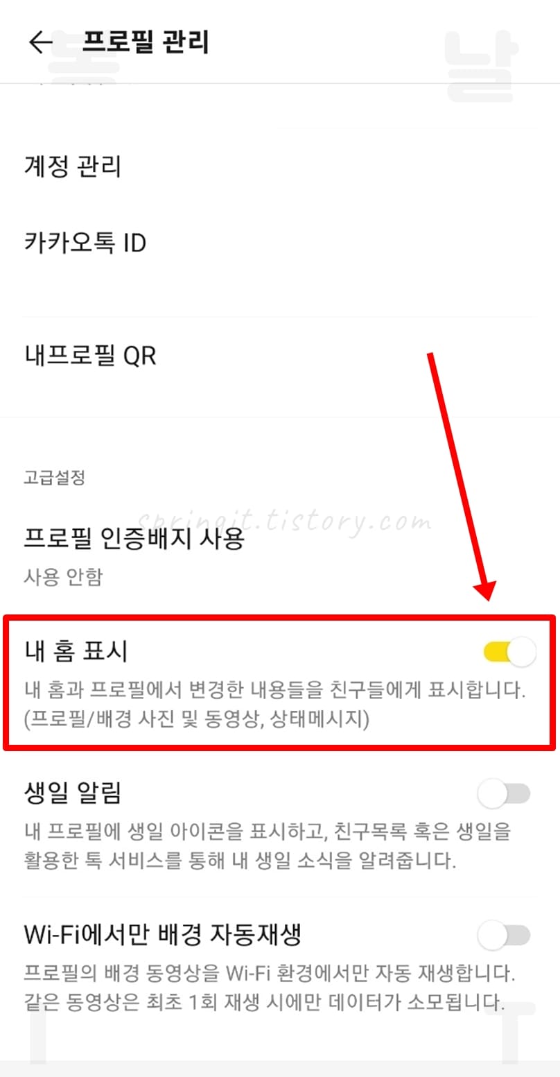 2. 고급설정 > 내 홈 표시 기능을 비활성화합니다.