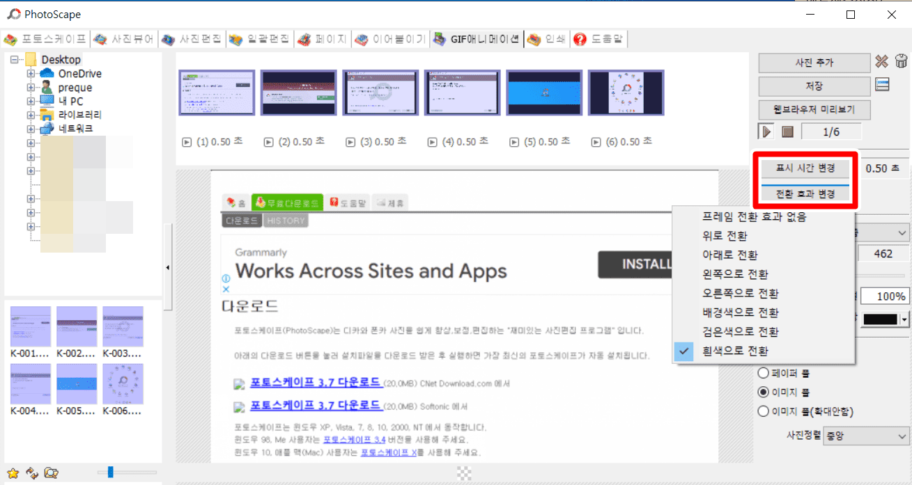 표시 시간은 각 사진들이 변경될 시간을 의미합니다. 기본이 0.5초이니 너무 빠르다면 시간을 늘려주시고 너무 느리다면 시간을 줄여주세요. 전환 효과를 하나씩 클릭해보셔서 GIF 디자인을 선택해주시면 됩니다.