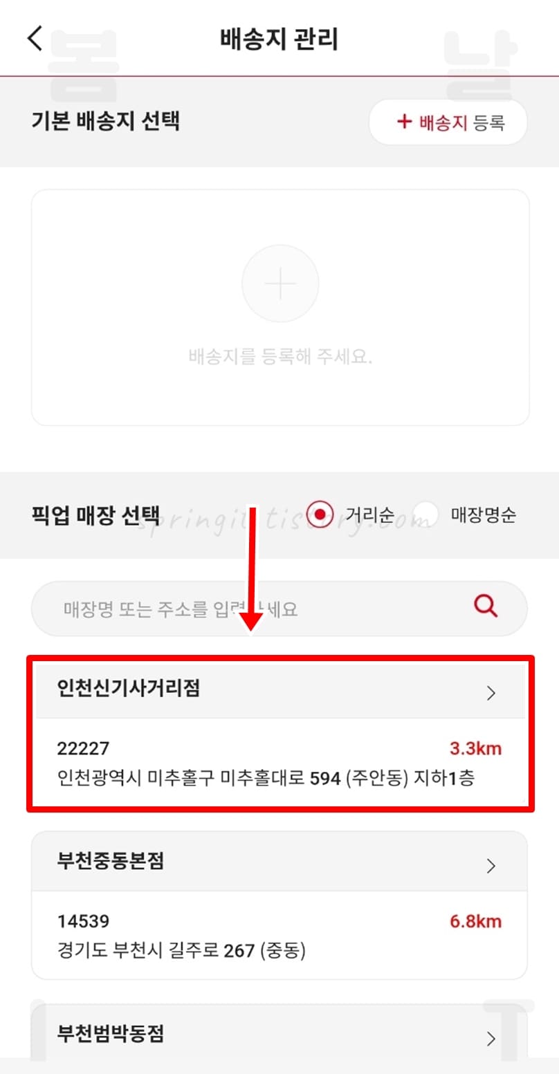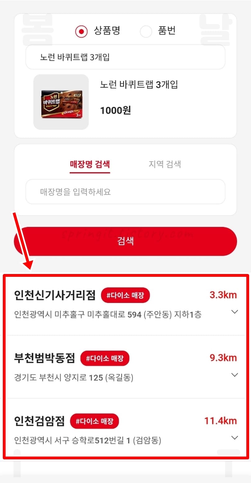 7. 아래 목록에서 내가 검색한 상품 재고가 있는 매장이 거리순으로 모두 표시됩니다.