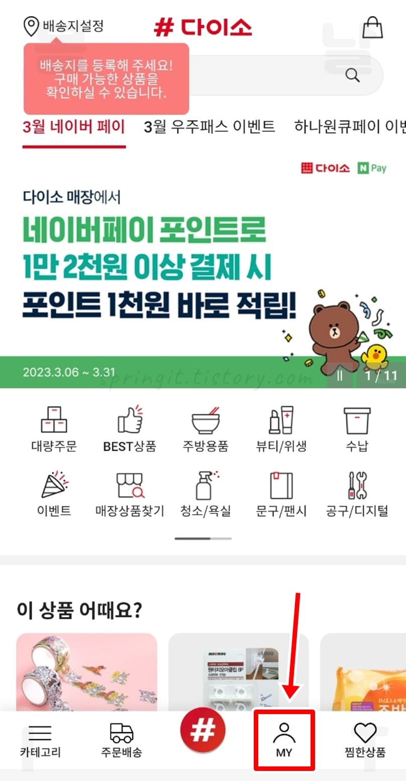 1. 샵다이소 어플에서 MY 메뉴를 클릭합니다.