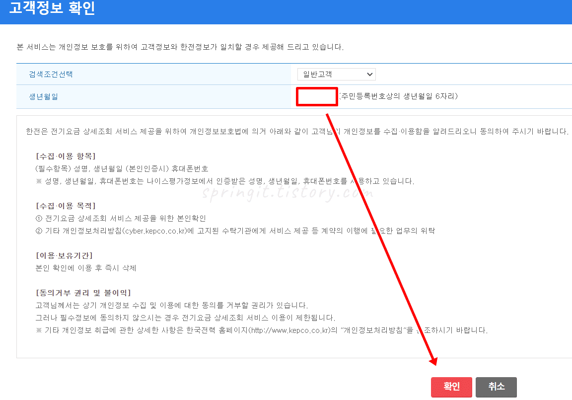 9. 나의 주민등록번호상 생년월일 앞 6자리를 기입하고 확인을 누릅니다.