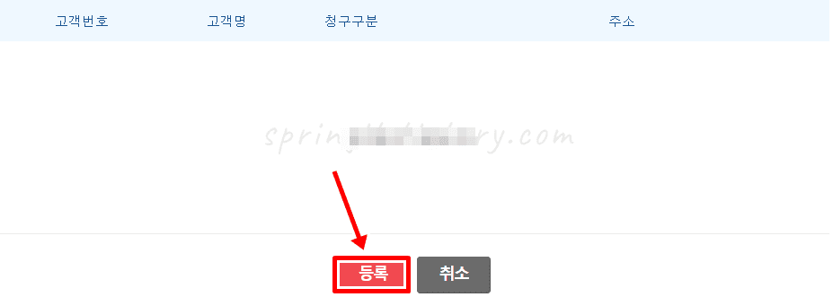 10. 검색된 고객번호를 선택하고 등록을 클릭하면 완료입니다.