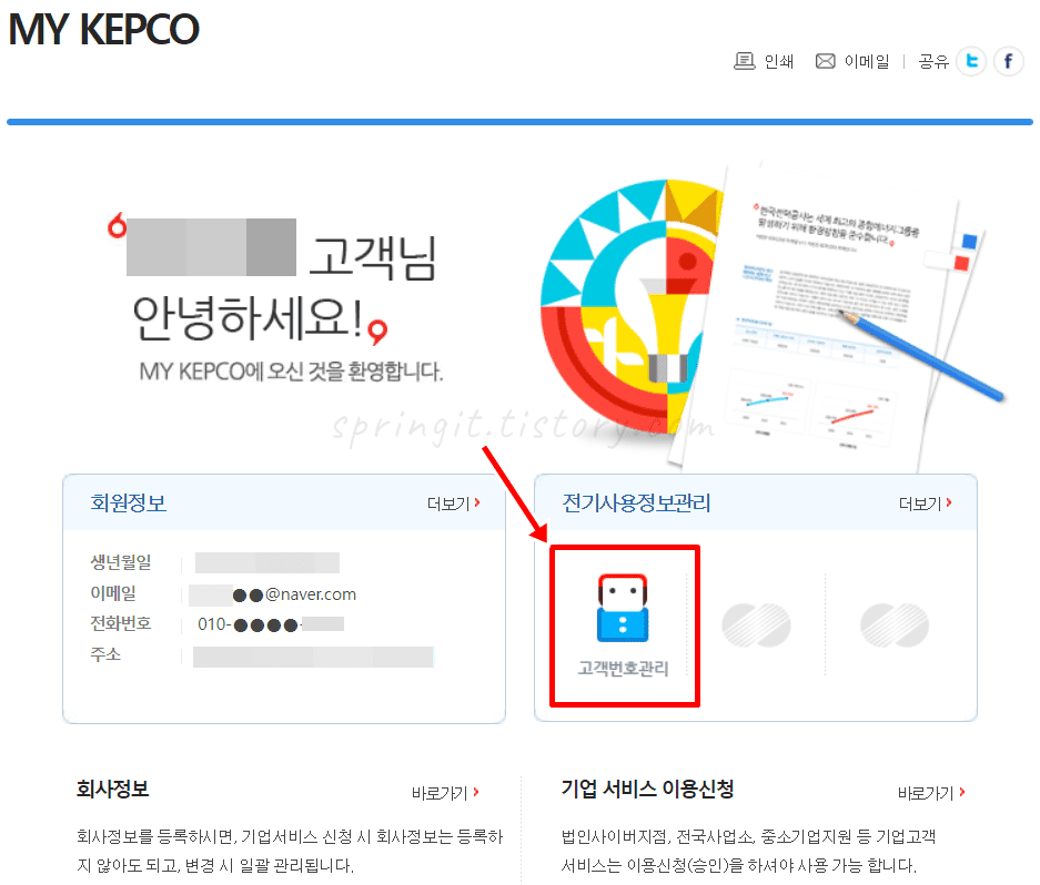 5. 전기사용정보관리 메뉴에서 고객번호관리를 클릭합니다.