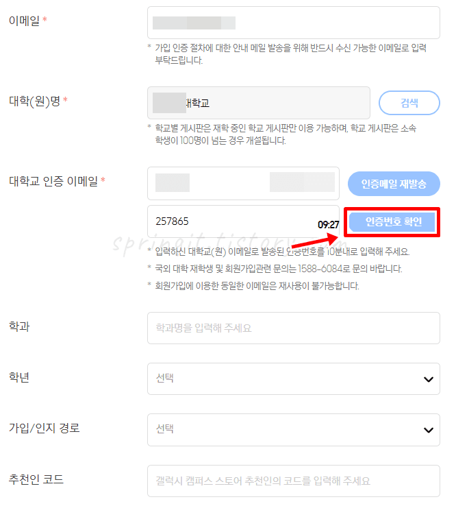 - 대학 이메일 인증으로 가입 (***@**.ac.kr 또는 **@**.edu)