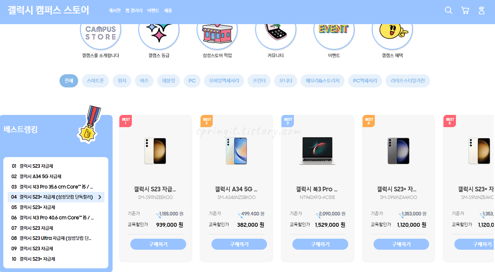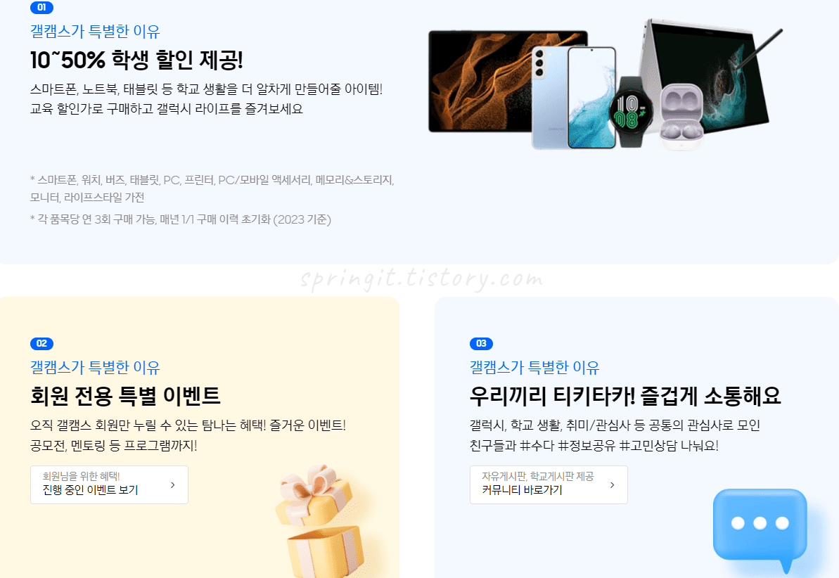 안녕하세요, 봄날의 아이티입니다. 오늘 글에서는 갤럭시 캠퍼스 스토어 가입 방법을 소개드리도록 하겠습니다.갤럭시 캠퍼스 스토어란 고등학생, 대학생(졸업생), 교원/교직원만 가입하여 할인가에 구매할 수 있는 삼성전자의 온라인 쇼핑몰입니다. 그래서 갤럭시 캠퍼스 스토어에 가입을 하면 갤럭시 스마트폰, 태블릿, 노트북 등 다양한 제품을 매우 저렴하게 할인된 가격으로 구매하실 수 있습니다. 그래서 많은 분들이 갤럭시 캠퍼스 스토어에 가입하고 싶어하시지만 가입과 인증 절차에 대해 어려움이 있으신 것 같아서 이번 글을 작성하게 되었습니다.