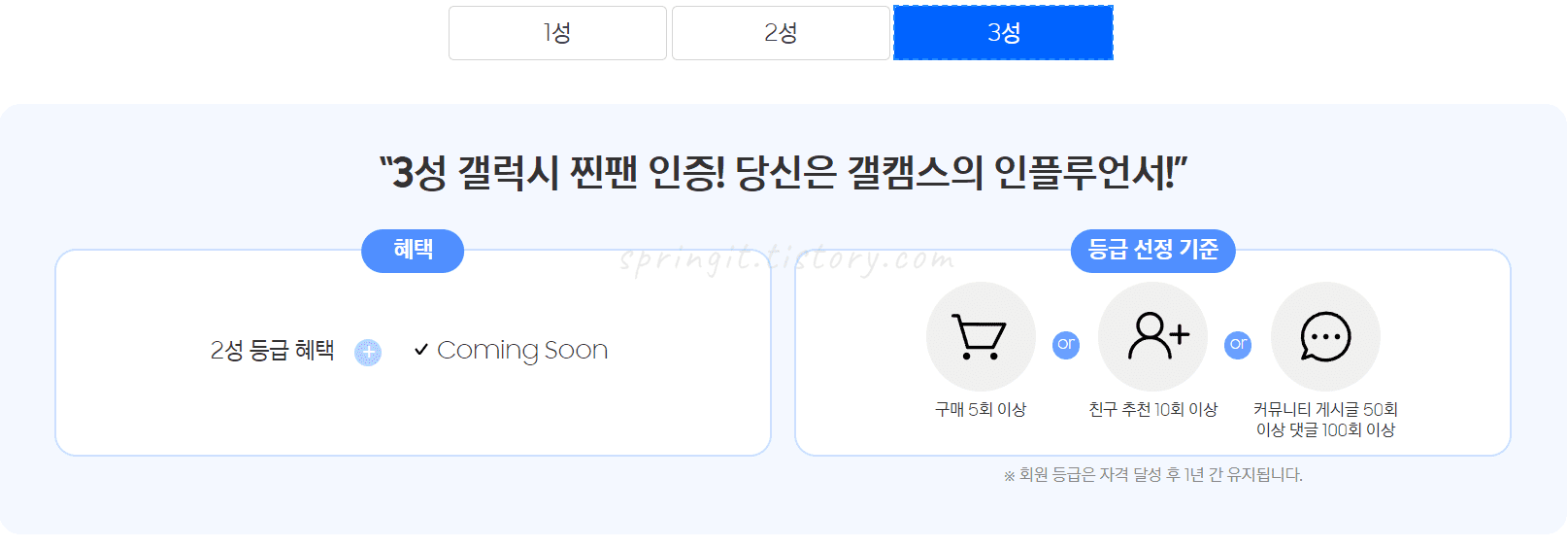 3성 등급선정기준: 구매5회이상 or 친구추천 10회 이상 or 커뮤니티 게시글 50회이상 댓글 100회 이상