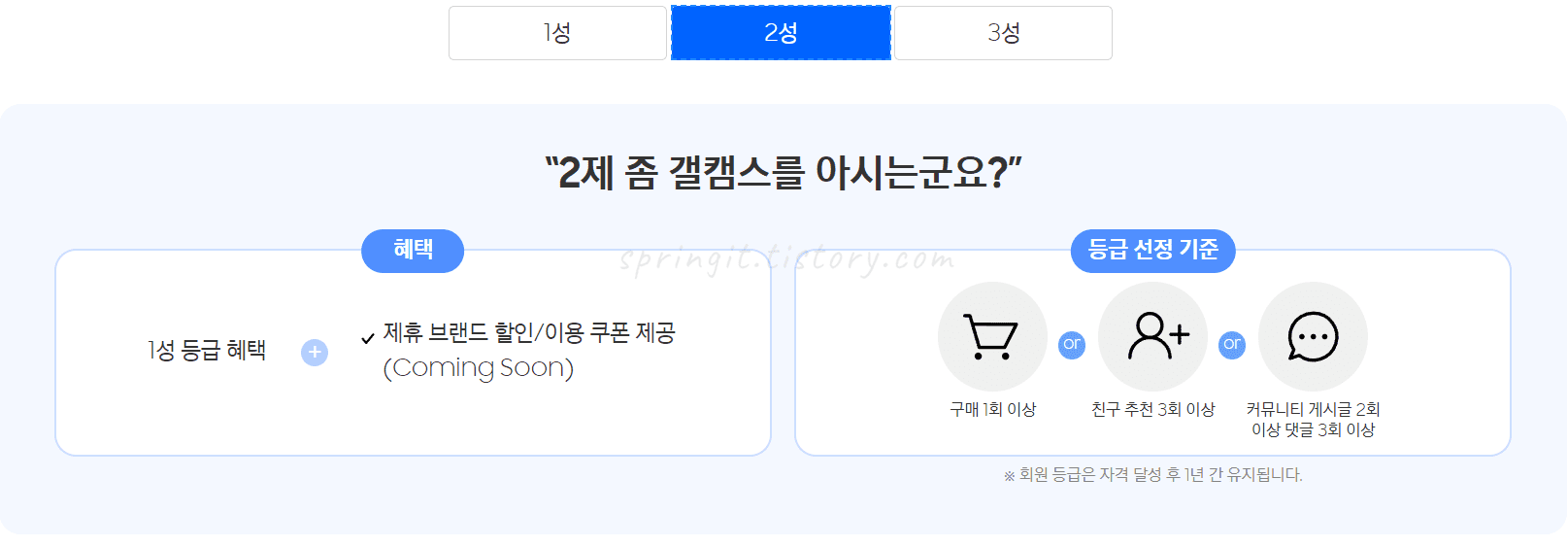 2성 등급선정기준: 구매1회이상 or 친구추천 3회 이상 or 커뮤니티 게시글 2회이상 댓글 3회 이상