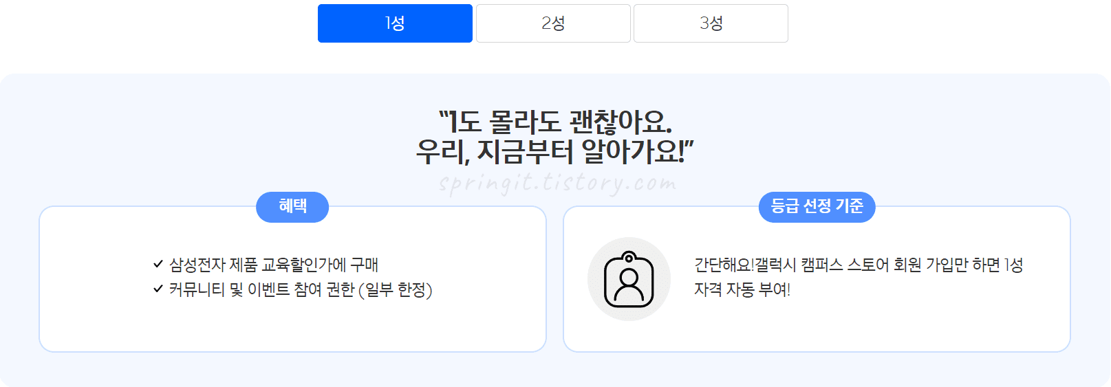 1성 혜택: 삼성전자 제품 교육할인가에 구매 / 커뮤니티 및 이벤트 참여 권한