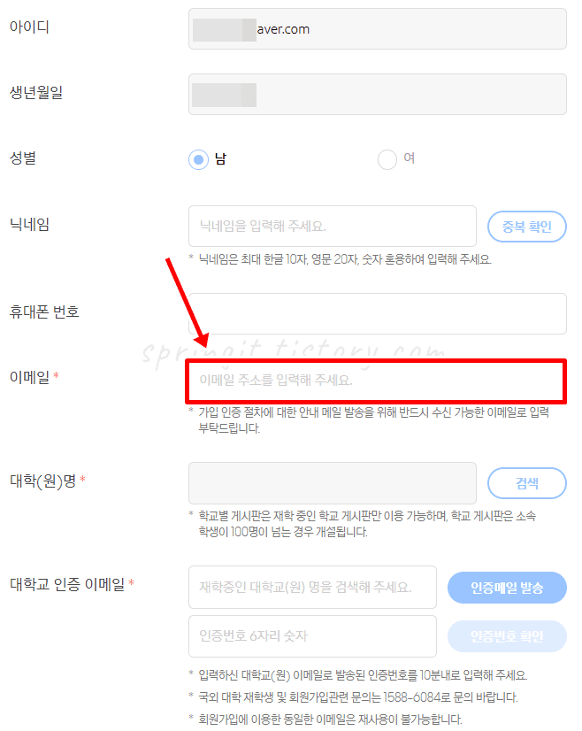 11. 이메일을 인증받을 대학교 이메일 주소를 기입합니다.