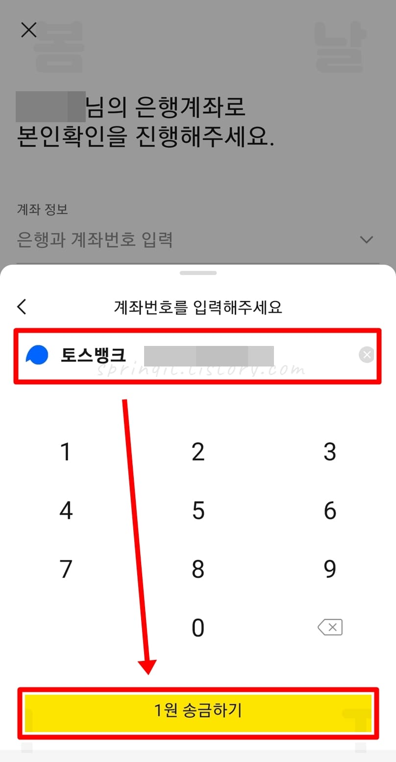 12. 나의 은행과 계좌번호를 입력하고 1원을 송금합니다.
