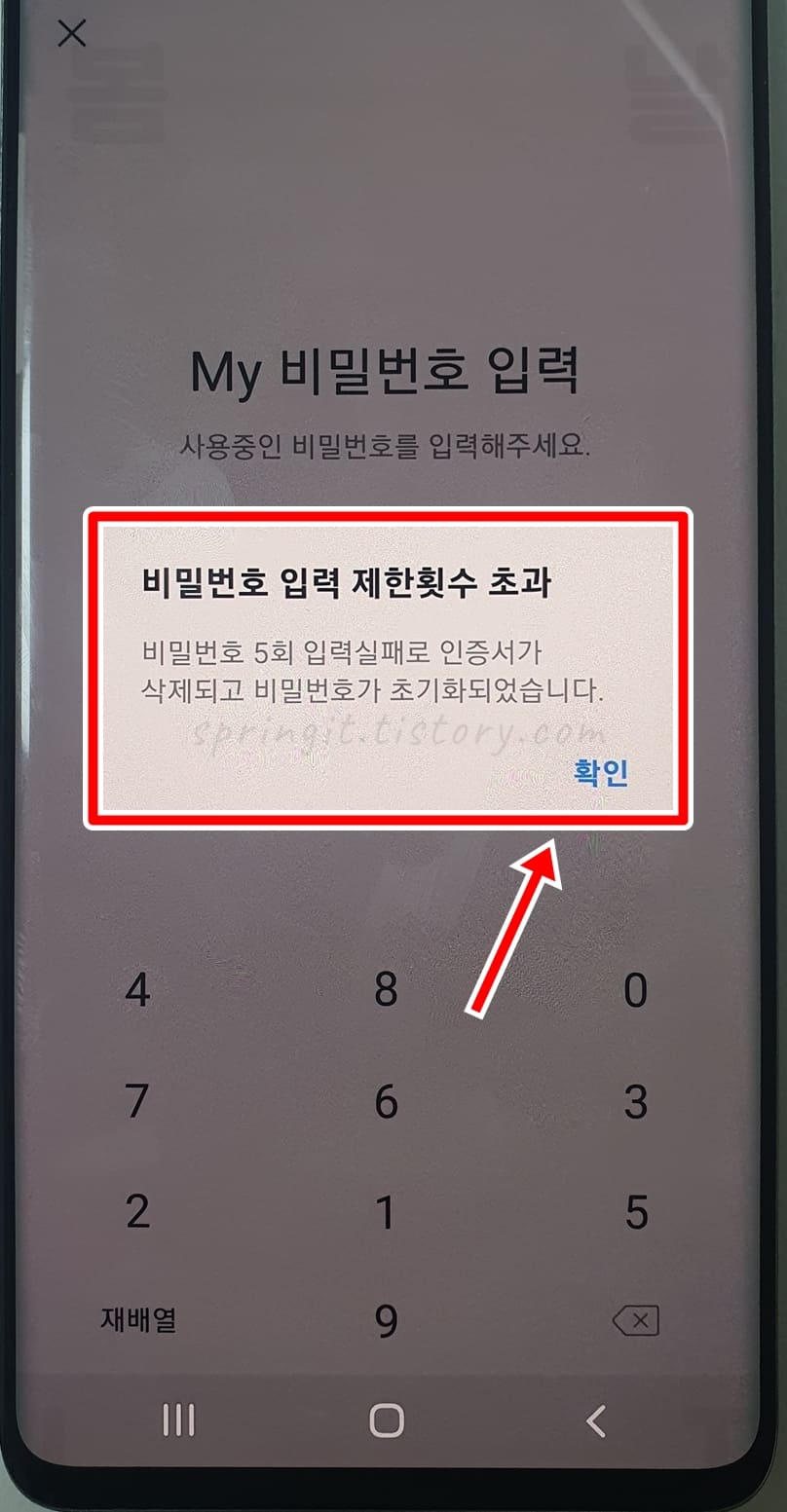 8. 5회 입력실패로 인증서 삭제 후 비밀번호 초기화 안내에 확인을 누릅니다.