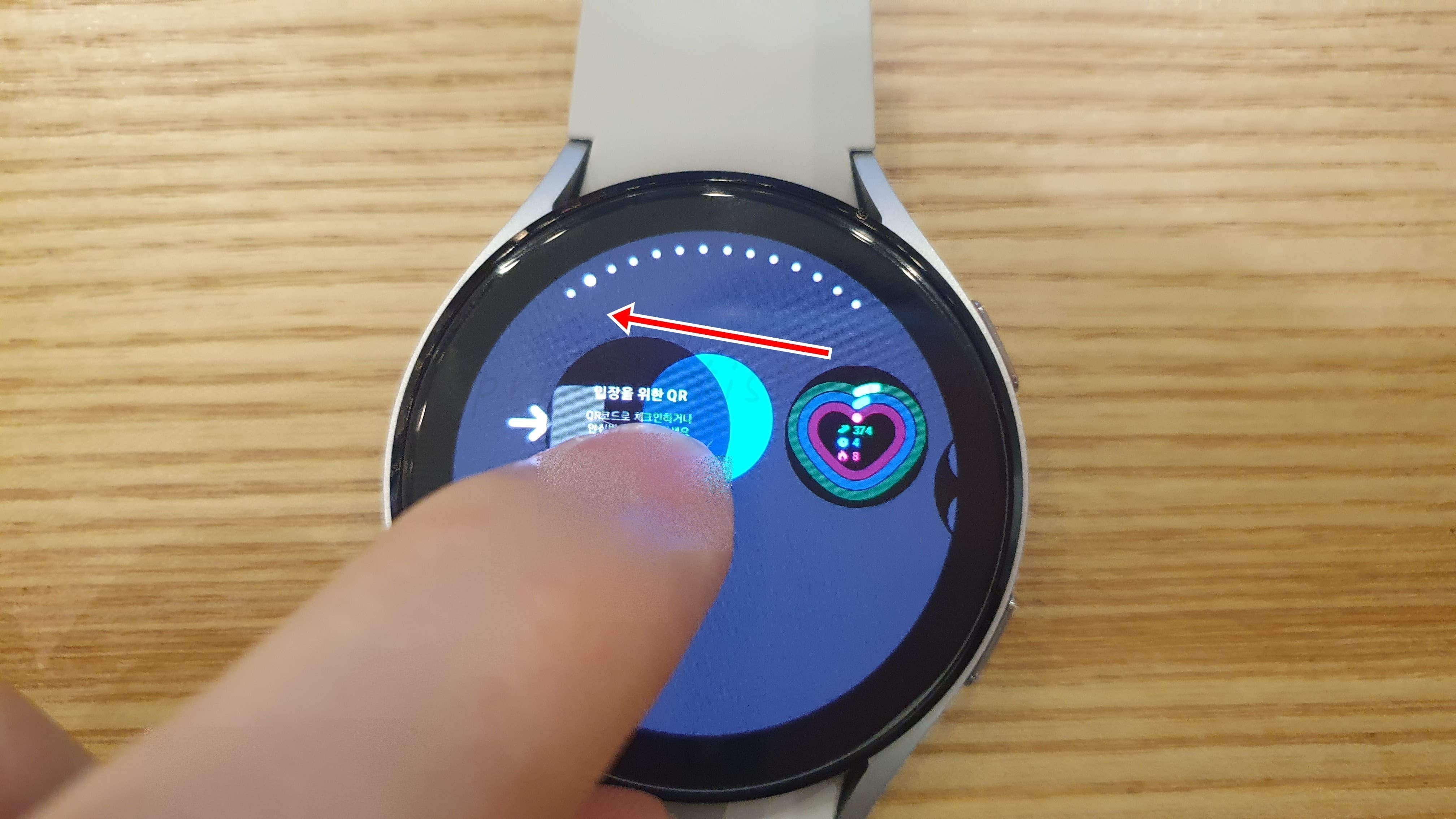 이제 갤럭시워치에서 위 설정으로 어떻게 카톡 QR코드 체크인을 빠르게 실행할 수 있는지 확인해보겠습니다. 갤럭시워치가 켜진 상태에서 화면을 우측으로 한번만 밀어주세요.