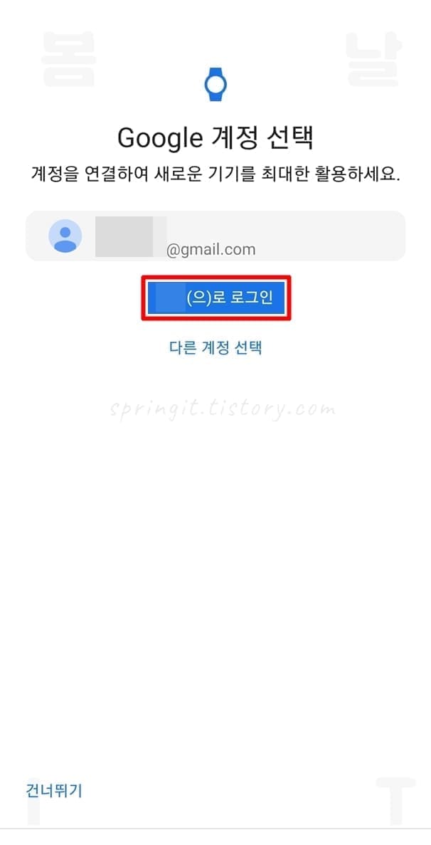 이 과정은 갤럭시워치에서 구글 계정이 로그인되지 않았을 때 플레이 스토어를 사용하기 위해서 로그인해주는 절차입니다. 갤럭시워치와 스마트폰을 처음 연결했을 때 구글 계정 로그인을 하셨던 분은 넘어가주시면 됩니다.