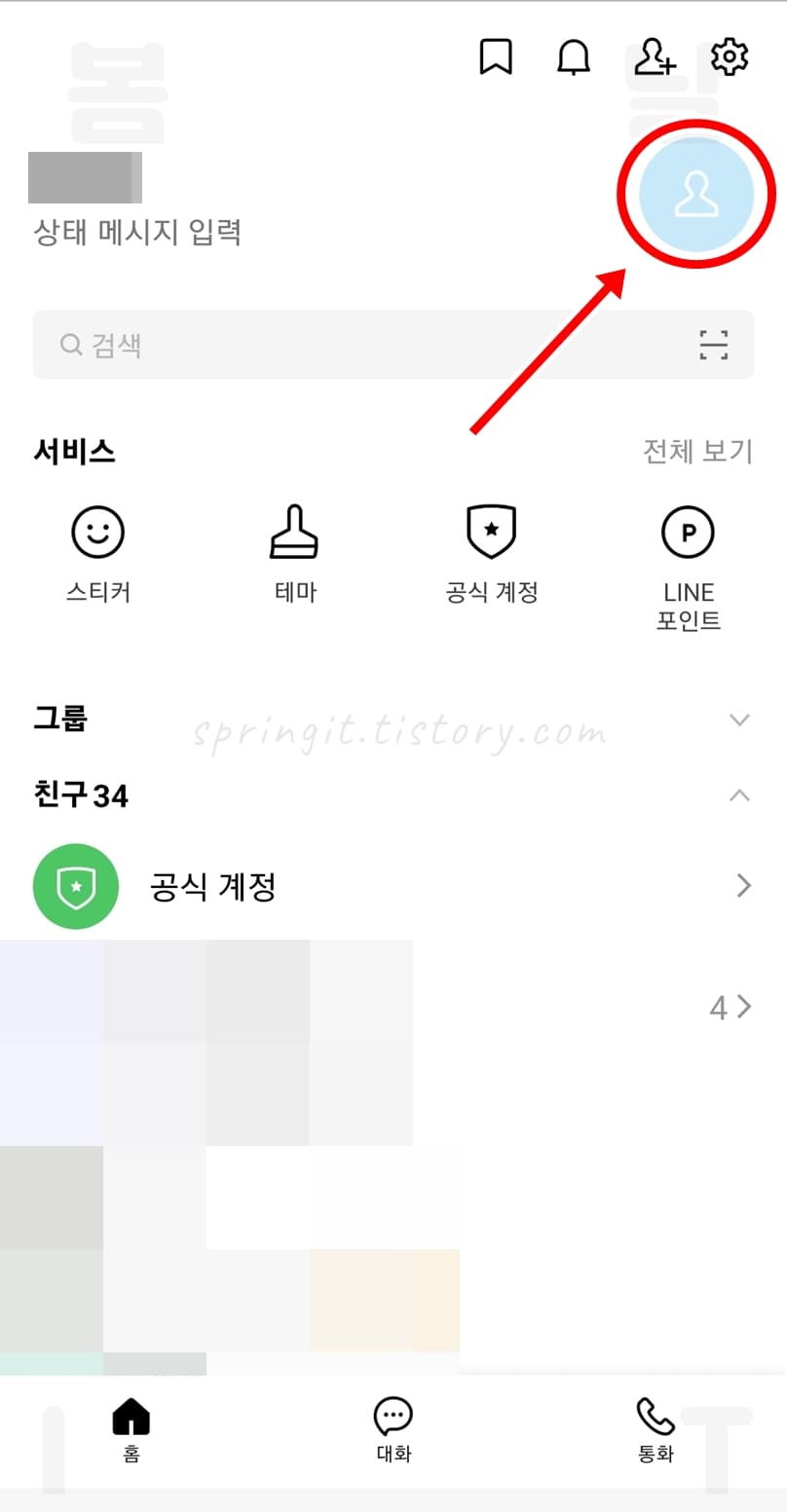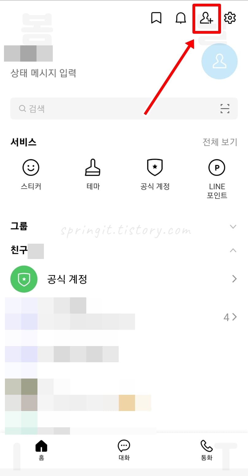 1. 라인 홈화면에서 우측 상단 사람+모양 버튼을 클릭합니다.