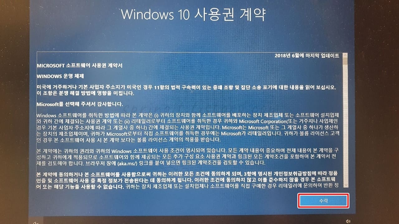 12. 윈도우10 사용권 계약에서 수락을 누릅니다.