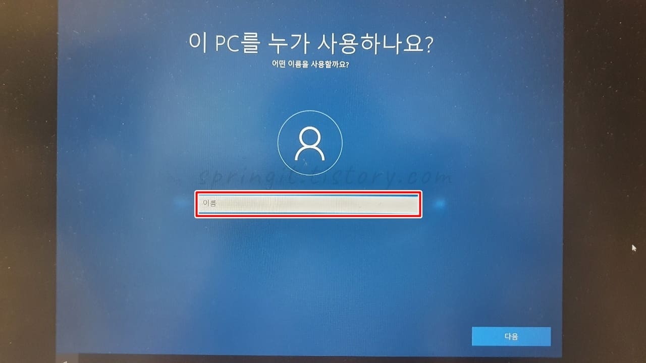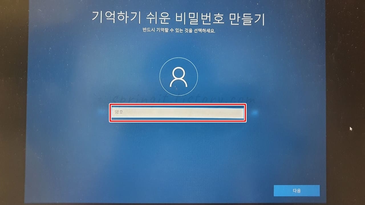 중요★- 비밀번호를 입력하지 말고 [다음]을 누르면 비밀번호없이 컴퓨터를 사용할 수 있습니다. 매번 컴퓨터를 켤 때마다 비빌먼호를 입력하고 싶지 않다면 빈칸상태로 다음을 누르세요!