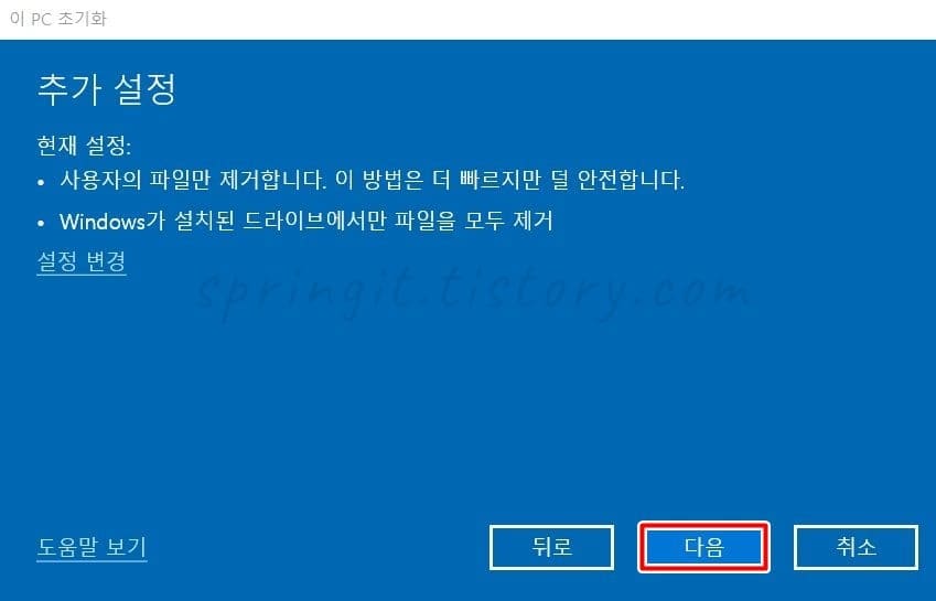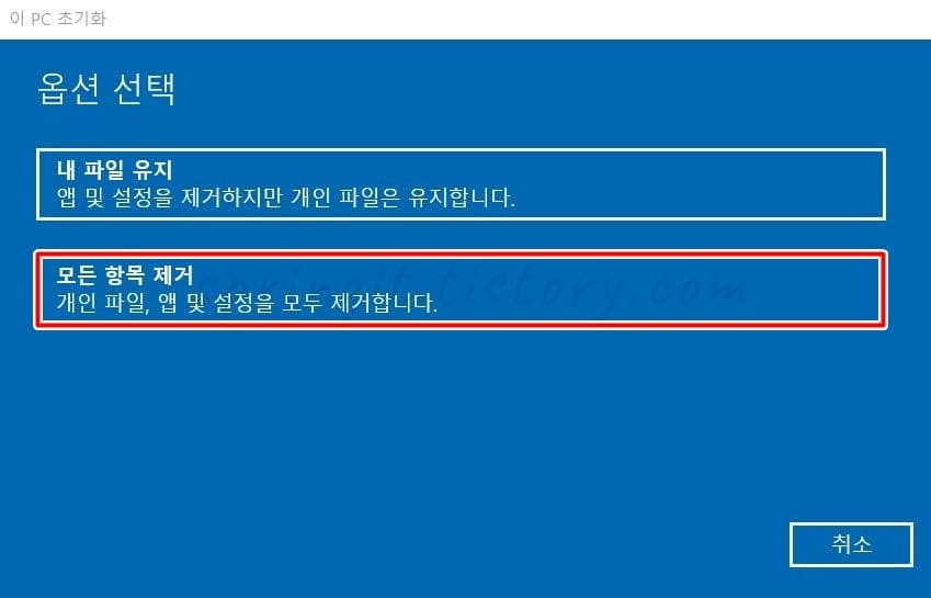 - 내 파일 유지- 앱 및 설정만 제거하고 개인 파일은 유지 됨
