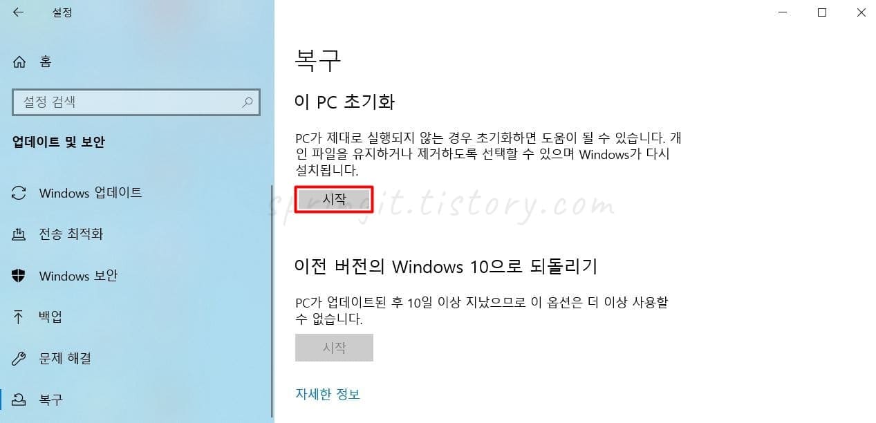 5. 이 PC 초기화 아래의 시작 버튼을 클릭합니다.