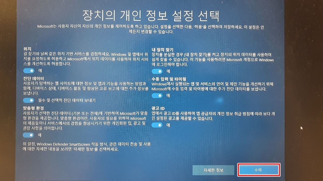 15. 장치 개인 정보 설정에서 수락을 누릅니다.