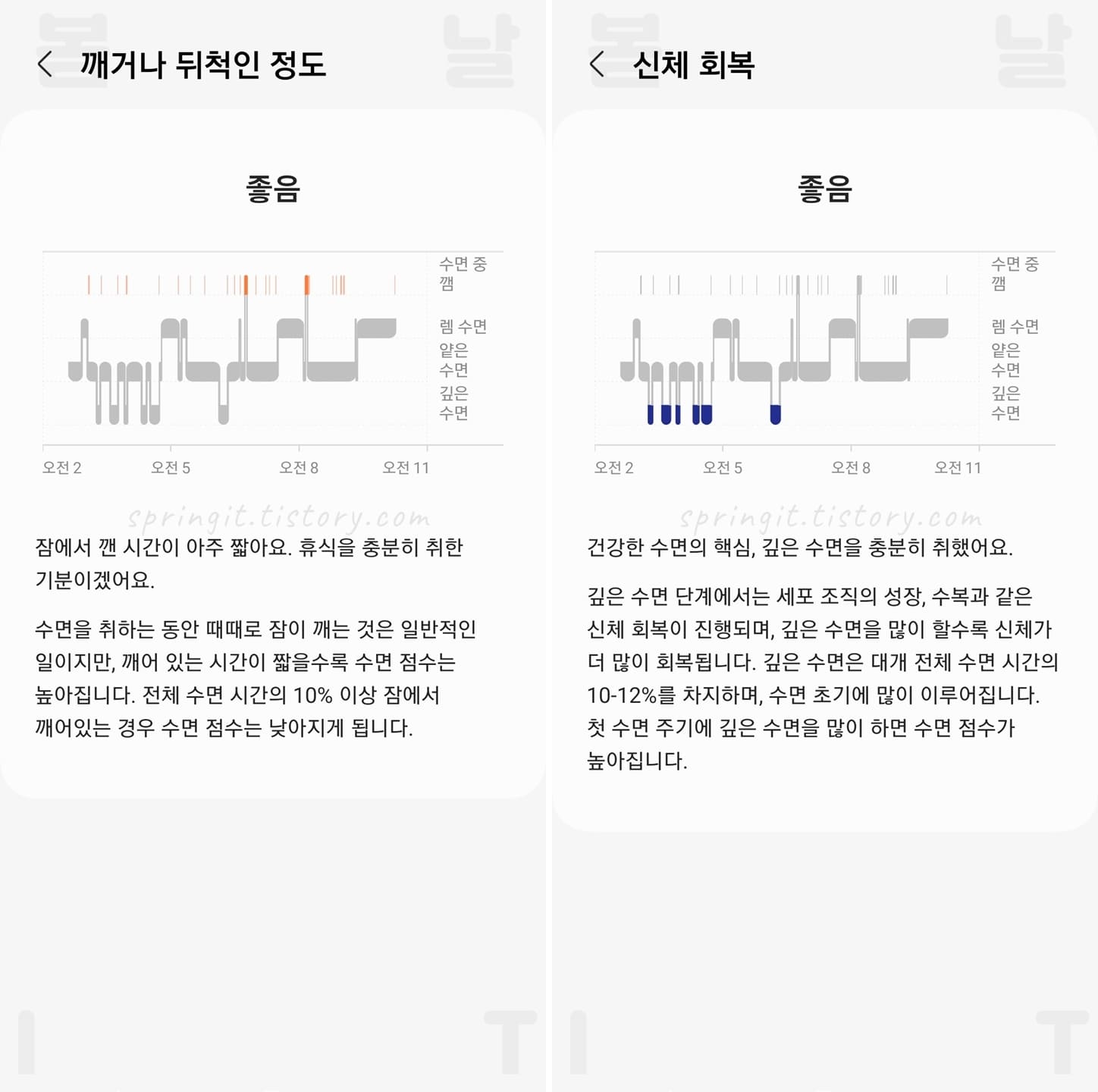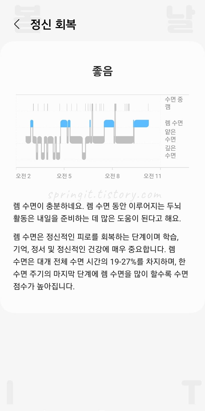 수면 중 깸, 렘 수면, 얕은 수면, 깊은 수면 시간을 확인할 수 있습니다.
