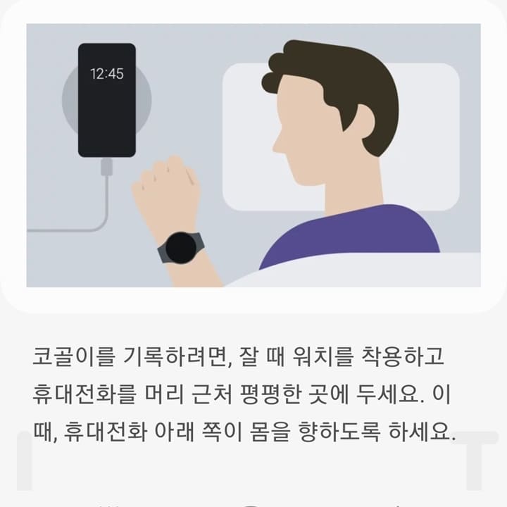 갤럭시 워치에서는 사용자의 심박수, 움직임을 토대로 수면 측정을 자동으로 실행하기에 별도의 on/off 기능이 없습니다. 여기까지 설정해주셨다면 이제 갤럭시워치를 착용하고 스마트폰을 머리 근처 평평한 곳에 두신 후 잠을 취해주시면 됩니다. 만약 본인이 코를 곤다면 자동으로 스마트폰의 녹음 기능이 실행되어 나의 코골이 소리도 들어볼 수 있습니다.